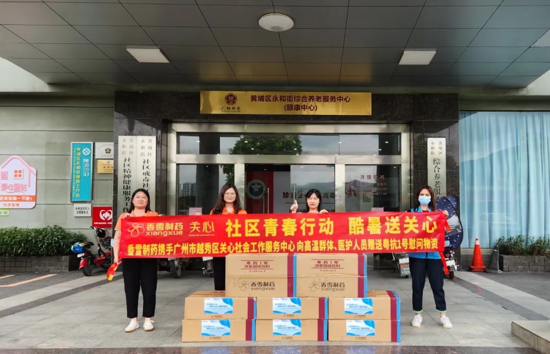 19日下午,香雪制药携手广州市越秀区关心社会工作服务中心走进黄埔区永和街禾丰、新庄、里享家、永岗、珠江嘉园、蓝藤、贤江、蓝青藤等社区,为辖区内的快递小哥/环卫等高温群体赠送粤抗1号凉茶物资。