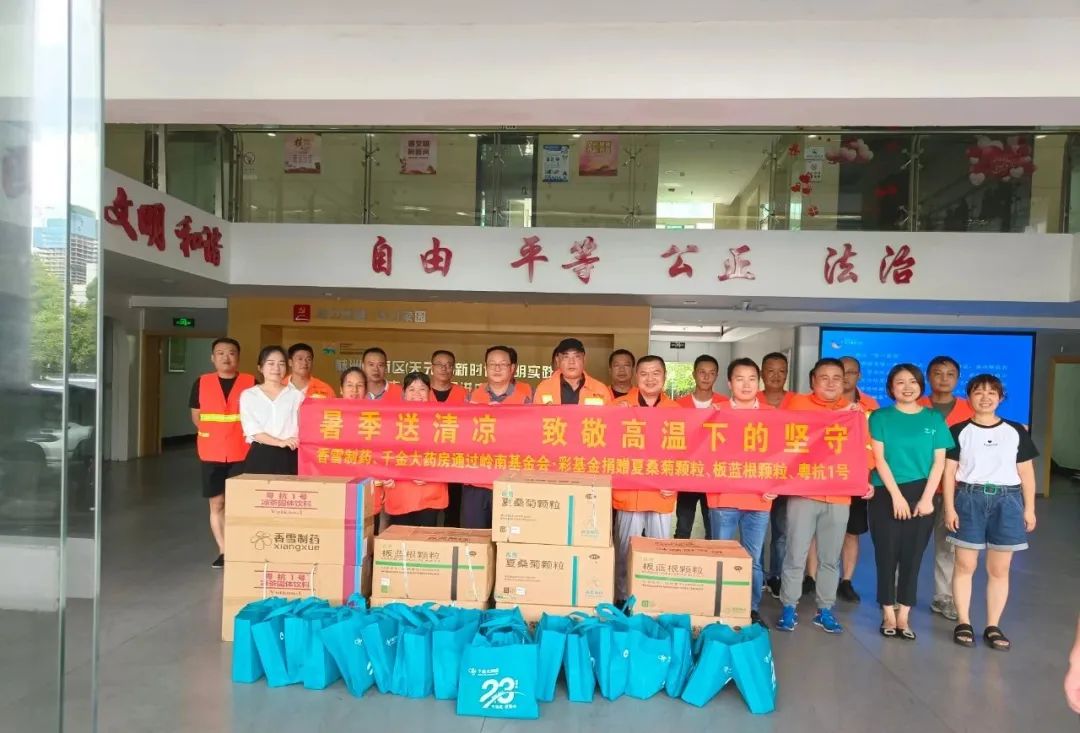 7月19日上午,香雪制药携手千金大药房通过广东省岭南教育慈善基金会·彩基金向湖南株洲环卫工人捐赠一批夏桑菊颗粒、板蓝根颗粒、粤抗1号凉茶爱心物资。