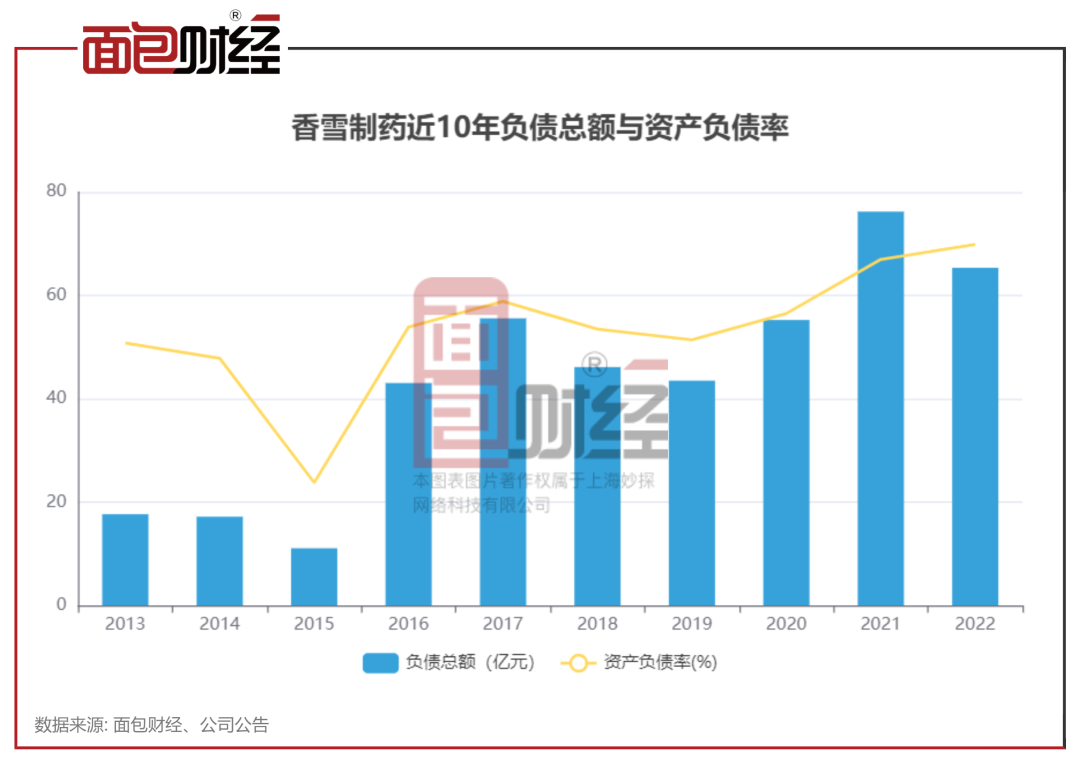 年报显示,香雪制药近5年负债总额分别为46.13亿元、43.5亿元、55.25亿元、76.23亿元、65.35亿元。资产负债率连续两年创新高,近5年分别为53.48%、51.41%、56.50%、66.98%、69.87%。