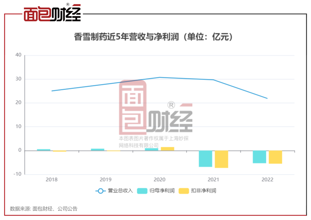 整体上看,2021年和2022年,香雪制药营业收入分别为29.71亿元、21.87亿元,同比下降3.3%、26.38%。同期,公司归母净利润分别为-6.88亿元、-5.33亿元,两年合计亏损12.21亿元。
