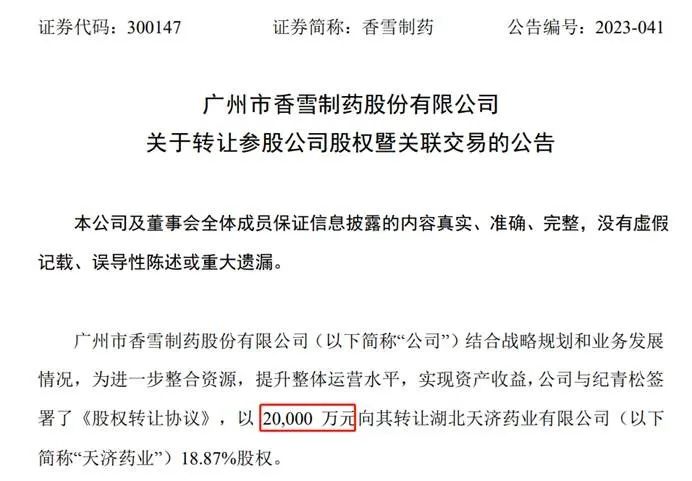 8月3日,香雪制药公告,公司与纪青松签署了《股权转让协议》,以2亿元向其转让天济药业18.87%股权。