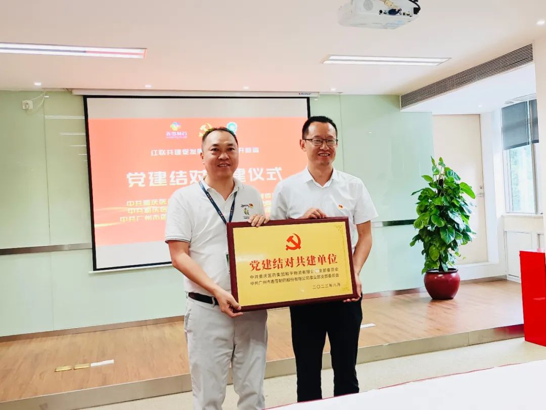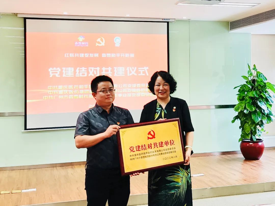 在党建结对共建仪式上,香雪制药事业部党支部分别与重庆和平批发党支部、重庆和平物流党支部互赠“党建结对共建单位”牌匾,表示今后将通过活动公办、组织共建、信息共享等方式,共同推动基层党组织党建交流共建,促进企业经营高质量发展。