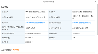 香雪制药新增一则股权冻结信息,股权被执行企业为广州香岚健康产业有限公司,冻结股权数额1000万人民币,冻结期限自2023年8月11日至2026年8月10日,执行法院为横琴粤澳深度合作区人民法院。