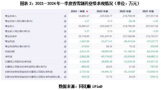 据财报,如图表2所示,2021—2024年一季度,香雪制药分别实现营收29.71亿元、21.87亿元、22.99亿元、5.69亿元;归母净利润呈连续亏损态势,亏损额分别为6.77亿元、5.30亿元、3.89亿元、3566.00万元,近三年来的亏损总额在16亿元以上。