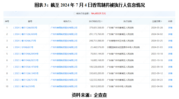 值得注意的是,如图表3所示,2023年4月至今,香雪制药还存在10笔被执行人信息,被执行总金额达16.47亿元,所属案件多为合同纠纷,涉及社会(S)维度中的客户、供应商等利益相关方。
