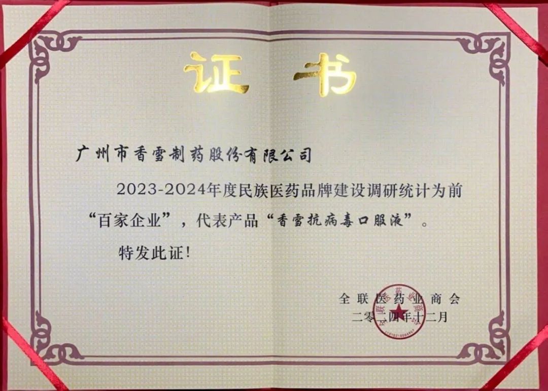 香雪制药以卓越的品牌实力与产品优势,入选“2023-2024年度民族医药品牌建设百家企业”,并以“香雪抗病毒口服液”作为代表产品,彰显了企业在民族医药品牌建设中的领军地位。