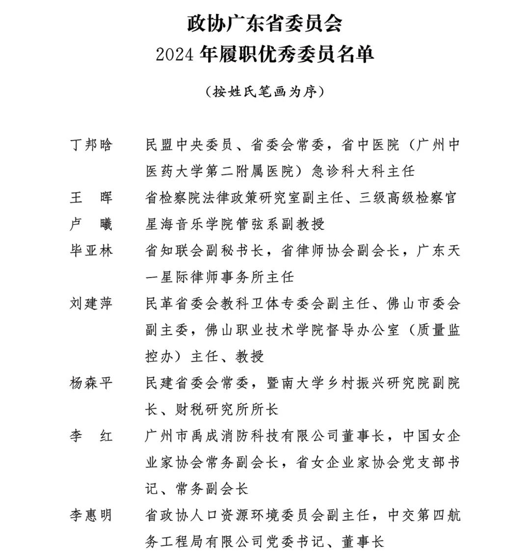 二、政协广东省委员会2024年履职优秀委员名单