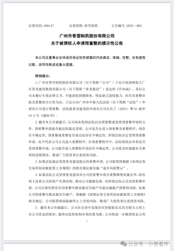 2月6日,香雪制药(300147.SZ)公告称,公司被债权人广东景龙建设集团有限公司(以下简称“景龙建设”)申请预重整。