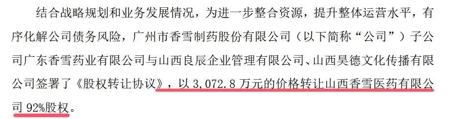 ——11月份以3073万元转让山西香雪医药92%股权。