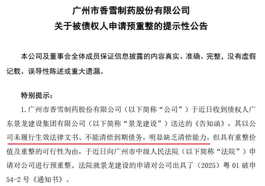 香雪制药(300147.SZ)日前发布公告称,已被债权人景龙建设向法院申请预重整。