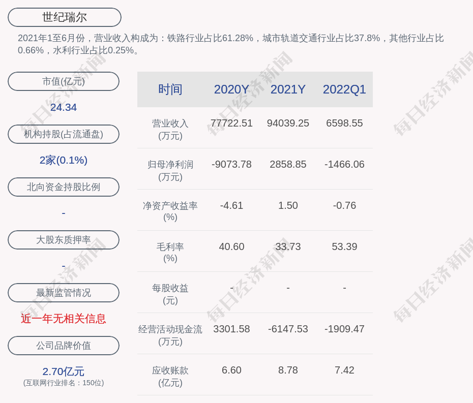 2021年1至6月份,世纪瑞尔的营业收入构成为:铁路行业占比61.28%,城市轨道交通行业占比37.8%,其他行业占比0.66%,水利行业占比0.25%。