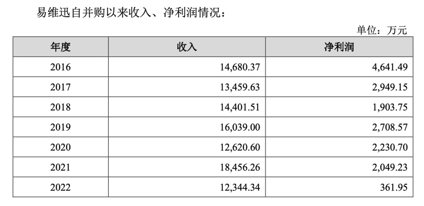 再看易维讯,根据业绩承诺,其2015年、2016年、2017年扣非归母净利润应分别不低于4000万元、5000万元、6000万元。但是除2015年外,其在2016、2017年分别实现净利润4641.49万元、2949.15万元,均未完成业绩承诺,甚至2017年仅完成业绩承诺的一半。2018年,易维讯业绩再度大幅下滑35.47%至1903.75。此后,世纪瑞尔2018年和2020年对收购其形成的商誉分别计提了8336.87万元和1.61亿元的减值准备。截至2022年三季度末,公司的商誉规模为4.84亿元。