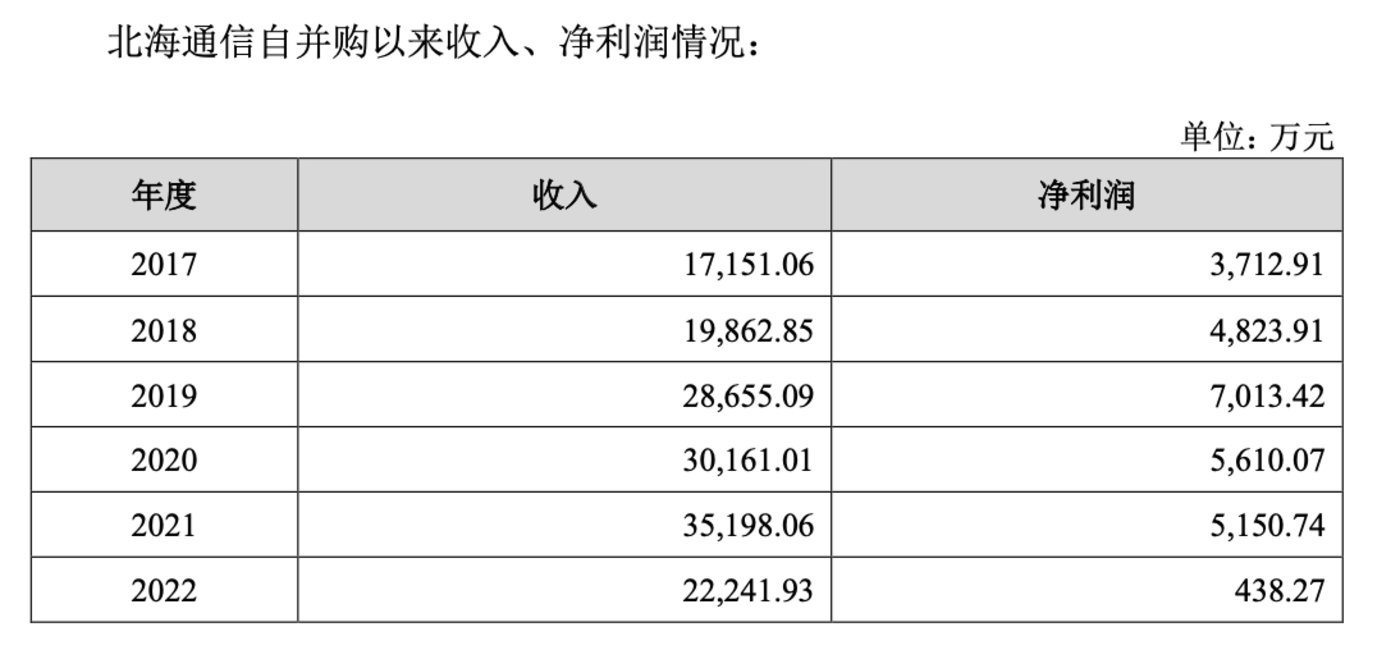 根据世纪瑞尔此前收购时签订的业绩承诺,要求北海通信2017年、2018年、2019年实现的扣非归母净利润分别不低于4000万元、5000万元、6100万元。然而收购后的前两年,北海通信均未完成业绩承诺,2017年、2018年分别实现扣非归母净利润3691.68万元、4823.91万元。2019年虽压线完成业绩承诺,但2020年刚过承诺期业绩就开始下滑,公司也从未计提商誉减值。