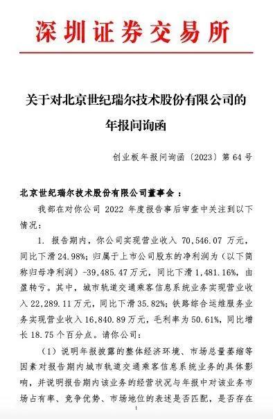 4月29日,北京世纪瑞尔技术股份有限公司(以下简称“世纪瑞尔”或“公司”)收到深圳证券交易所的年报问询函。问询函要求世纪瑞尔说明年报披露的整体经济环境、市场总量萎缩等因素对报告期内城市轨道交通乘客信息系统业务的具体影响,并说明报告期内该业务的经营状况与年报中对该业务市场占有率、竞争优势、市场地位的表述是否匹配,是否存在夸大宣传等误导性陈述等。