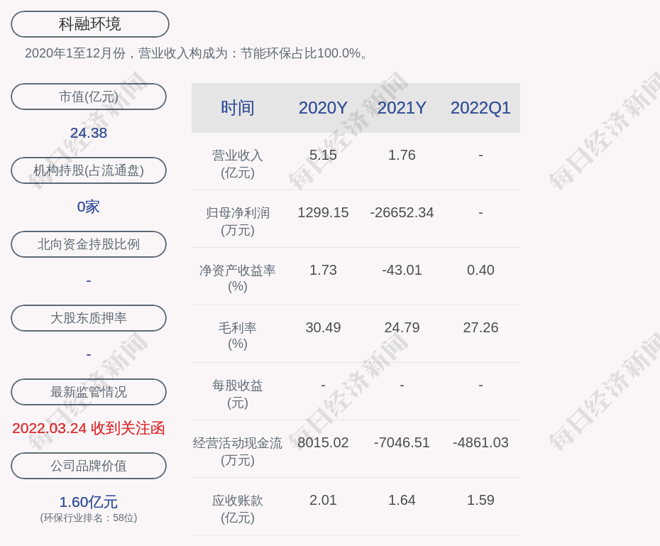2020年1至12月份,科融环境的营业收入构成为:节能环保占比100.0%。