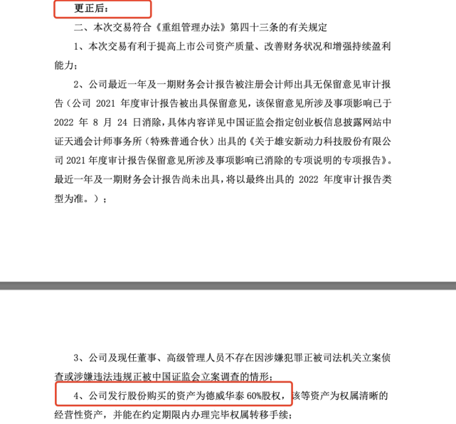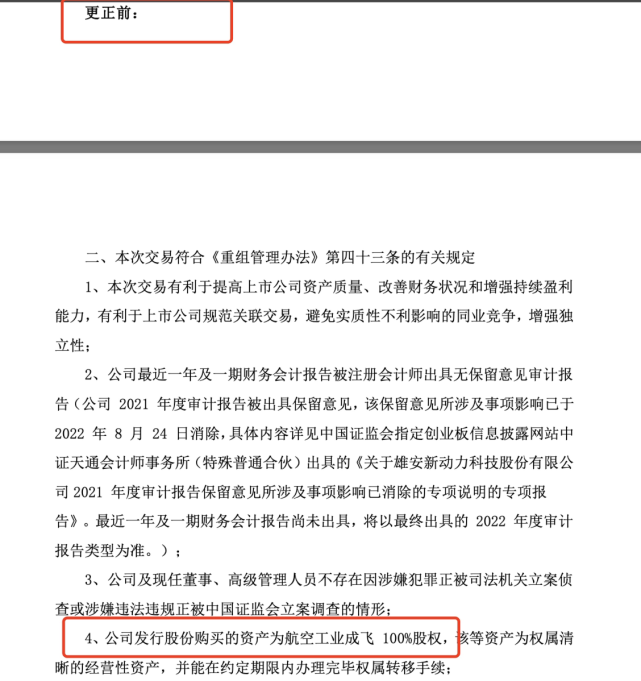 此外,新动力疑似将收购标的名称直接复制照搬。根据更正前的公告,“公司发行股份购买的资产为航空工业成飞100%股权”。然而更正后的内容为“公司发行股份购买的资产为德威华泰60%的股权”。