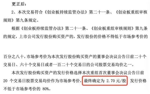 发行价上,新动力也写错了。在《关于本次交易符合〈创业板上市公司持续监管办法(试行)〉以及〈深圳证券交易所创业板上市公司重大资产重组审核规则〉相关规定的说明》中,新动力将发行价误写为“8.39元/股”,此后更正为2.70元/股。