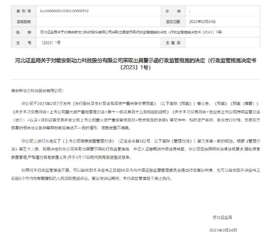 河北证监局指出,雄安新动力科技股份公司上述行为违反了《上市公司信息披露管理办法》(证监会令第182号,以下简称《管理办法》)第三条第一款的规定。根据《管理办法》第五十二条,我局决定对雄安新动力科技股份公司采取出具警示函的行政监管措施,并记入证券期货市场诚信档案。