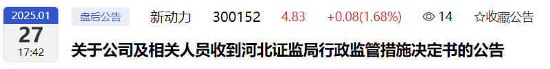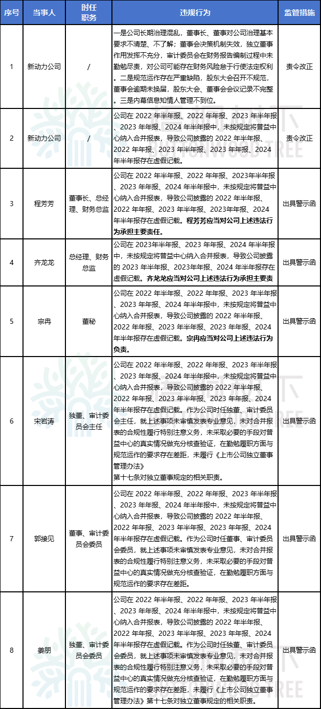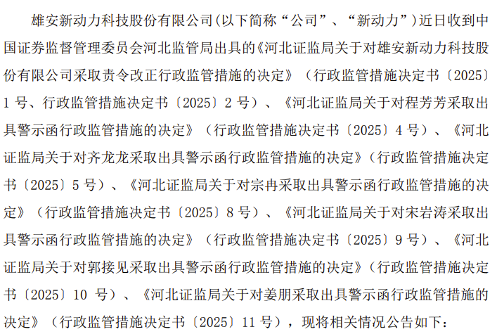 1月27日收盘后,雄安新动力科技股份有限公司公告公司及相关人员收到河北证监局行政监管措施决定书共8份。这8份决定书涉及违规行为两大项。一、公司长期治理混乱,董事长、董事对公司治理基本要求不清楚、不了解;董事会决策机制失效,独立董事作用发挥不充分,审计委员会在财务报告编制过程中未勤勉尽责,对公司可能存在财务风险怠于行使法定权利。规范运作存在严重缺陷,股东大会召开不规范,董事会逾期未换届,股东大会、董事会会议记录不完整。二、公司在 2022 年半年报、2022 年年报、2023 年半年报、2023 年年报、2024 年半年报中,未按规定将普益石家庄股权投资基金管理中心(有限合伙)(以下简称普益中心)纳入合并报表,导致公司披露的 2022 年半年报、2022 年年报、2023 年半年报、2023 年年报、2024 年半年报存在虚假记载。公司被河北证监局采取责令改正的行政监管措施。6名时任董事长、总经理、财务总监、独董、审计委员会主任及委员、董秘被河北证监局采取出具警示函的行政监管措施。