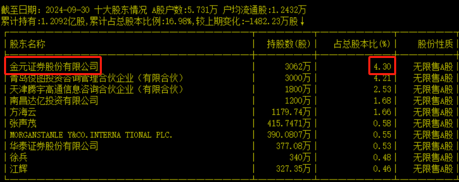 当前公司注册资本7.128亿元。截至2024年9月30日,公司第一大股东为金元证券,持股比例只有4.30%。
