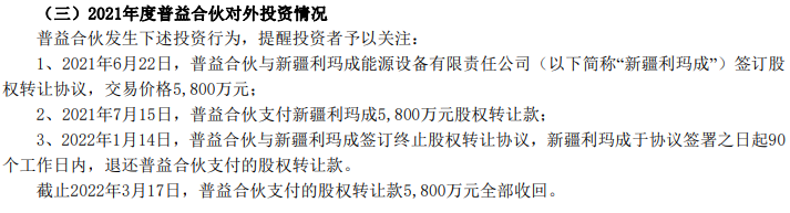 2021年6月,普益基金以现金形式收购了新疆利玛成能源设备有限责任公司(简称“新疆利玛成”)持有的巴州君创能源有限责任公司(简称“巴州君创”)29.5%股权,支付了股权转让款5800万元,不过2022年1月双方终止了股权转让协议,新疆利玛成随后分四次退回普益基金5800万元。