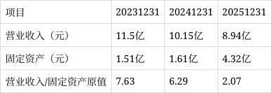 ?单位固定资产收入产值逐年下降。近三期年报,营业收入/固定资产原值比值分别为7.63、6.29、2.07,持续下降。