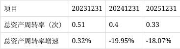 ?总资产周转率持续下降。近三期年报,总资产周转率分别0.51,0.4,0.33,总资产周转能力趋弱。