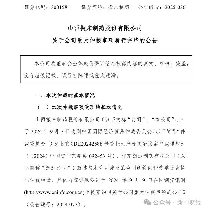 7月18日晚间,振东制药(300158.SZ)发布公告称,公司重大仲裁事项已执行完毕。依据相关《裁决书》要求,振东制药已向朗迪制药支付最后一笔1亿元款项。截至公告发布日,振东制药已按照《裁决书》内容全额支付完毕全部款项,总计5亿元。