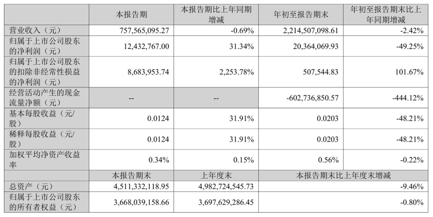 10月22日晚,该公司发布的三季报显示,2025年前三季度,公司营收约22.15亿元,同比减少2.42%;归属于上市公司股东的净利润约2036万元,同比减少49.25%;基本每股收益0.0203元,同比减少48.21%。整体走势向下。