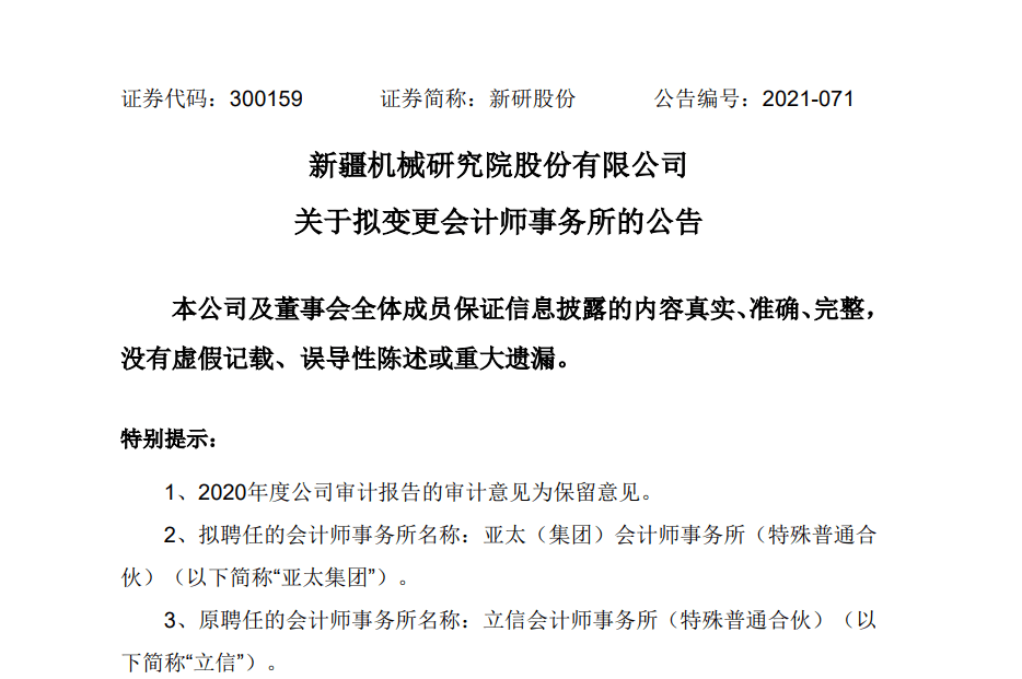 新研股份披露拟不再聘任立信会计师事务所(特殊普通合伙),并拟聘任亚太(集团)会计师事务所(特殊普通合伙)作为2021年年报审计机构。立信所已连续十年为新研股份提供审计服务,但2020年度,则对新研股份的财务会计报告出具的审计意见为保留意见。