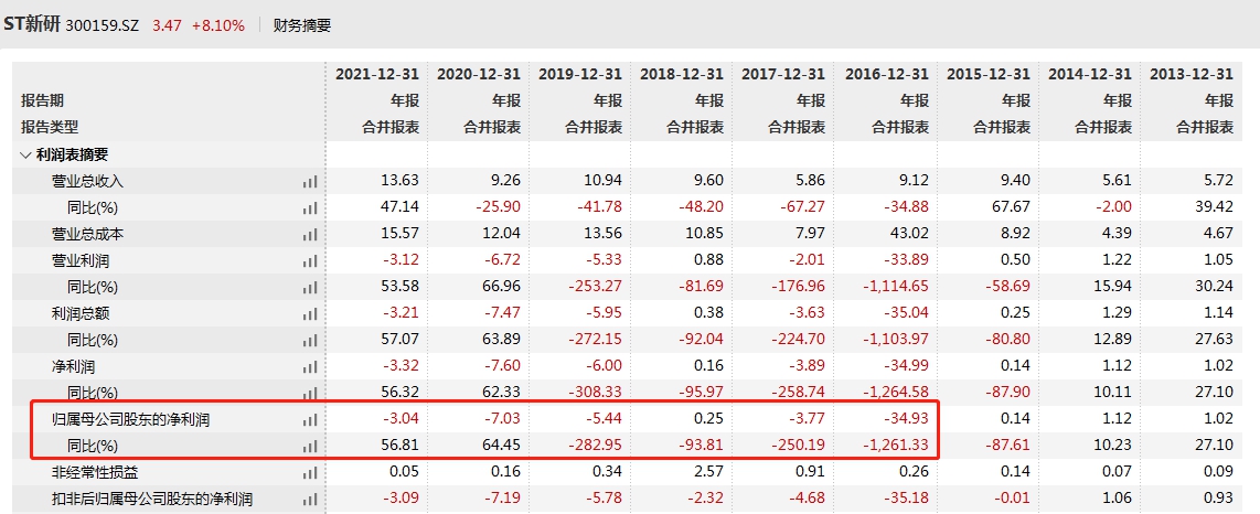 财务数据显示,近年来ST新研业绩持续承压。2016年至2021年间,仅在2018年实现盈利。2022年度业绩预告,ST新研预计2022年实现盈利0.73亿元至1亿元。