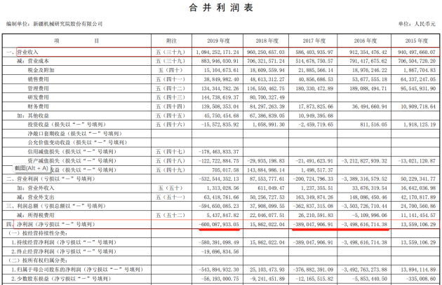 ST新研更新版《2015年度至2019年度的审计报告》的合并利润表,体现了该公司营收稳健的特点,但营业利润、净利润等指标的亏损惊人。
