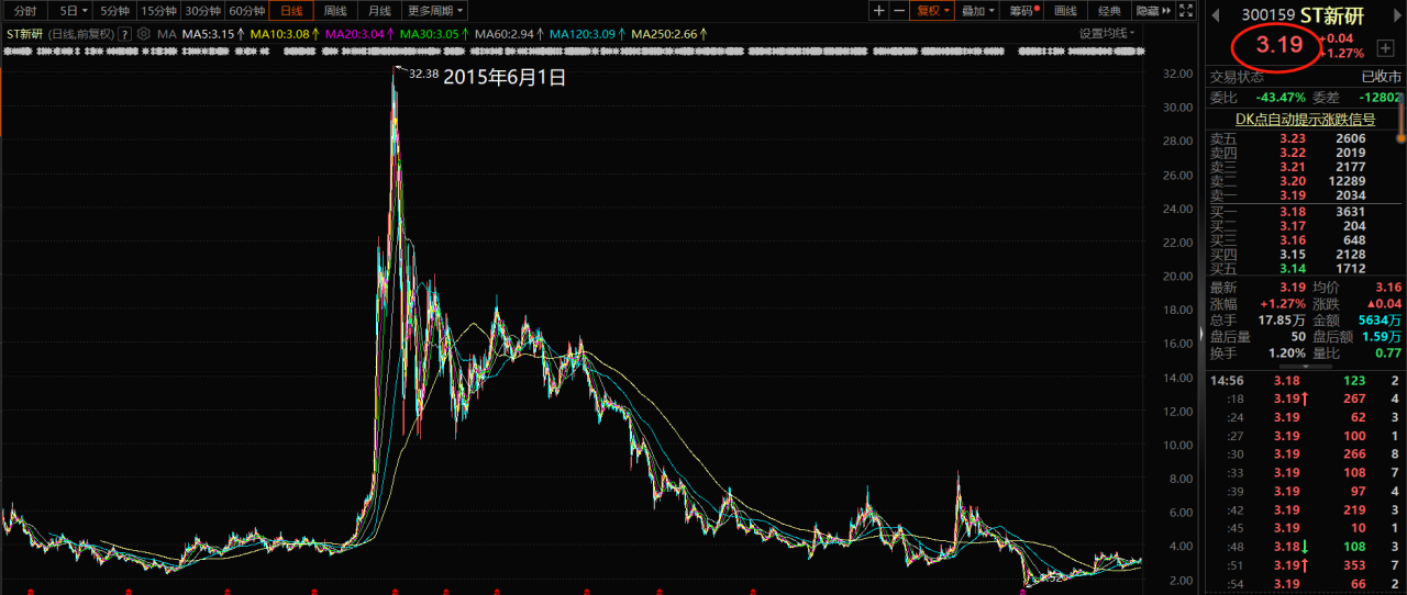 《电鳗财经》注意到,截至6月26日收盘,ST新研股价为3.19元,而在2015年6月份,该公司股票曾在盘中创出32.38元的历史最高价(前复权价)。这几年的时间里,该公司股价伴随着大幅震荡,持续回落。