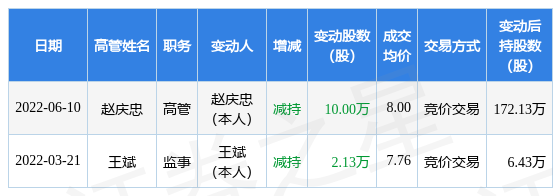 证券之星讯,根据6月13日市场公开信息、上市公司公告及交易所披露数据整理,秀强股份(300160)(300160)最新董监高及相关人员股份变动情况:2022年6月10日公司高管赵庆忠共减持公司股份10.0万股,占公司总股本为0.0162%。变动期间公司股价上涨5.89%,6月10日当日收盘报7.91元。
