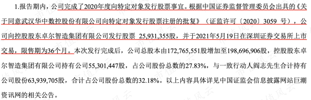 2021年5月14日,华中数控又搞了一次专门针对控股股东卓尔制造4.28亿的定增,一致行动人持股比例提高到32.18%。