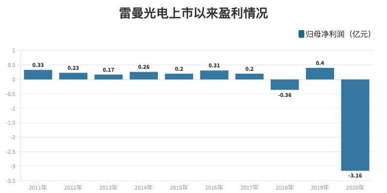 而最致命的一次打击发生在2020年。2020年雷曼光电出现巨额亏损,当期净利润为-3.16亿元。至此,公司上市10个年度(2011年-2020年)累计实现归属于上市公司股东的净利润为-1.41亿元。