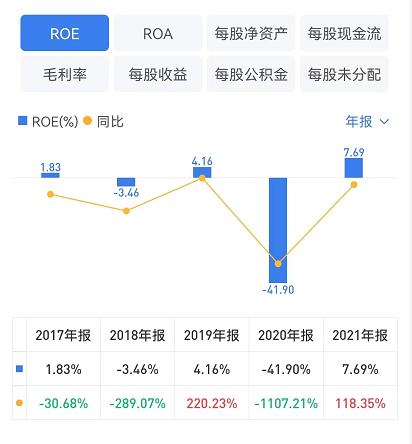 从ROE(净资产收益率)来看,2018年-2021年,雷曼光电ROE分别为-3.46%、4.16%、-41.9%、7.69%。2021年,雷曼光电ROE回正。