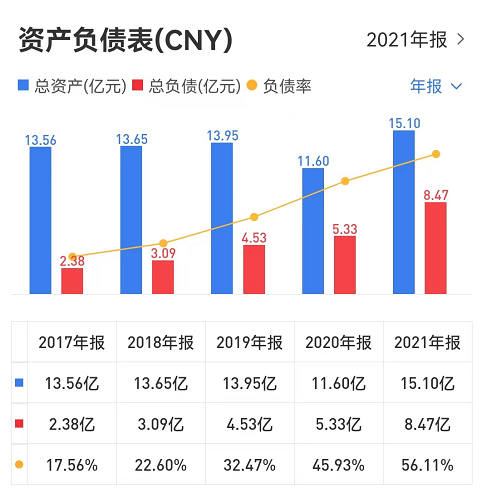2017年-2021年,雷曼光电负债率分别为17.56%、22.6%、32.47%、45.93%、56.11%。雷曼光电负债率连续五年攀升。
