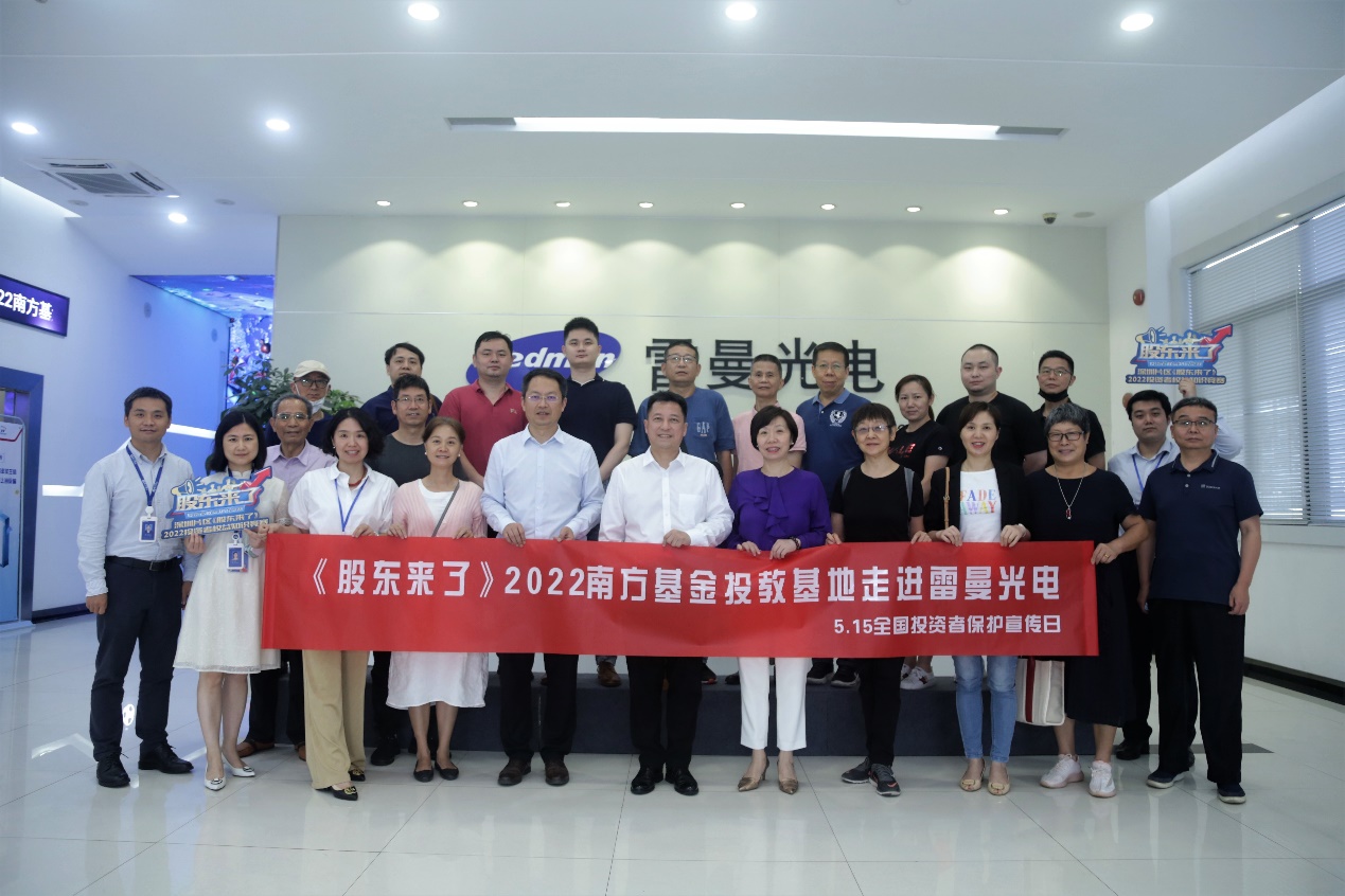 为了增进投资者对上市公司经营管理情况的了解,促进投资者与上市公司之间的沟通与交流,深入开展《股东来了》2022投资者权益知识竞赛精品化活动,丰富投教服务形式,2022年5月26日,南方基金组织投资者走进上市公司,参访了参与北京冬奥会“冰雪五环”研发制造的中国第一家LED显示屏高科技上市公司——深圳雷曼光电科技股份有限公司。南方基金客户关系部总经理代庆红、执行董事周琦、董事陆文清,雷曼光电董事长李漫铁、董事会秘书左剑铭及南方基金投资者等近30人参与本次活动。
