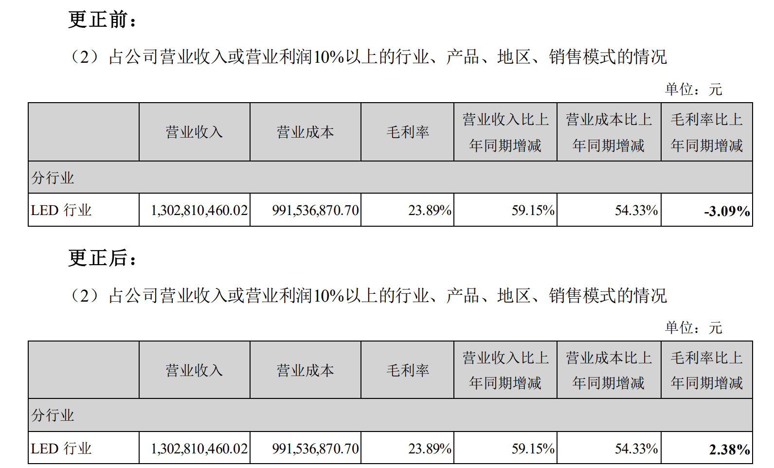 占公司营业收入或营业利润10%以上的行业、产品、地区、销售模式的情况中,LED行业毛利率比上年同期增减由-3.09%更正为2.38%。