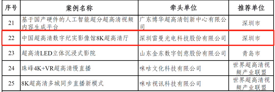 近日,工业和信息化部办公厅、国家广电总局办公厅发布《关于公布超高清视频典型应用案例名单的通知》,公布了104项超高清视频典型应用案例。其中,深圳在文教娱乐领域有4项,在医疗健康领域有1项,雷曼光电的《中国超高清数字纪实影像馆8K超高清厅》项目强势上榜。