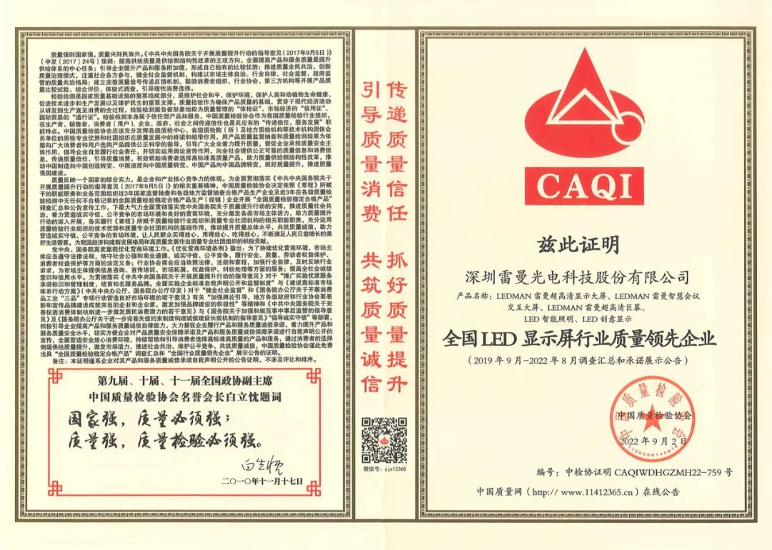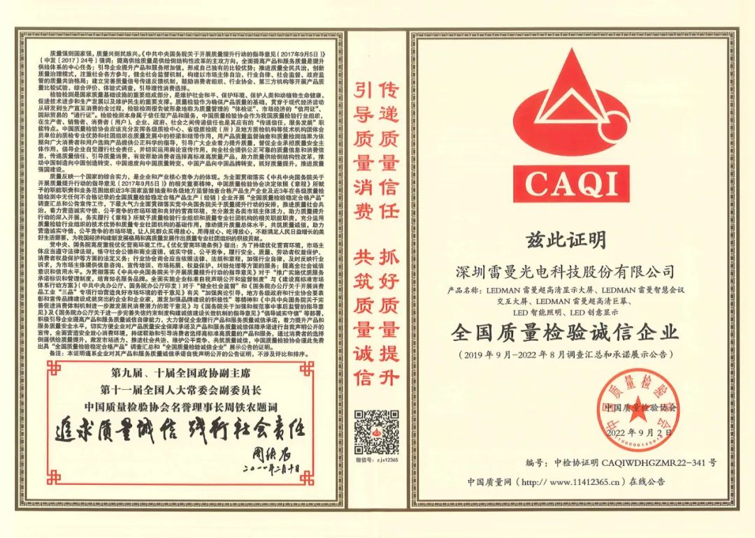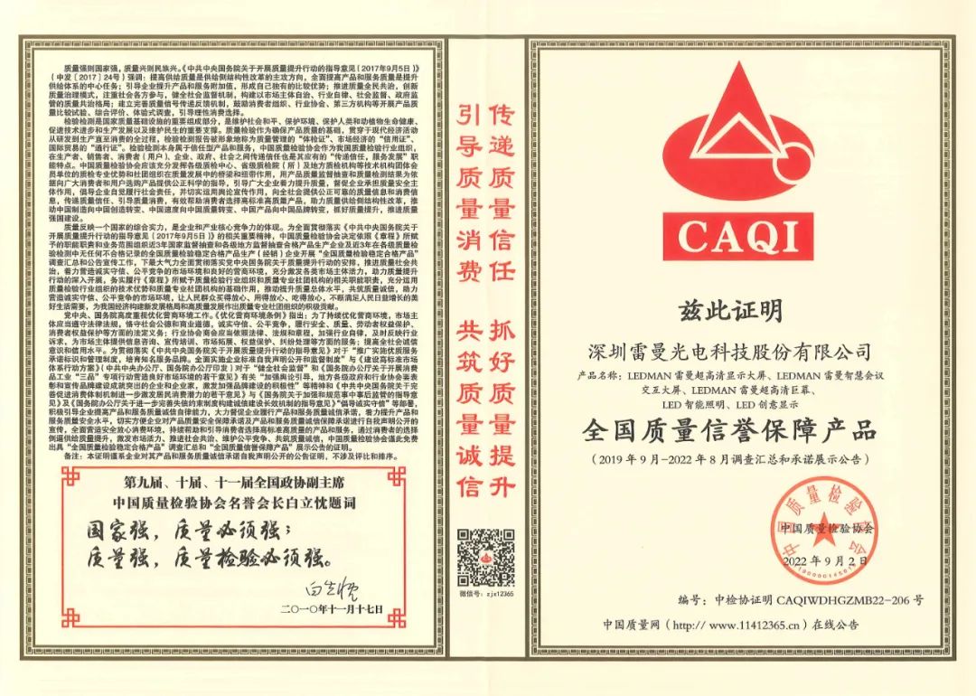 金秋九月,雷曼光电以卓越的品质和高标准的工艺技术,经过重重筛选及严格的审核,在2022全国“质量月”活动中荣获“全国LED显示屏行业质量领先企业”、“全国质量检验诚信企业”、“全国质量信誉保障产品”三重权威认证。