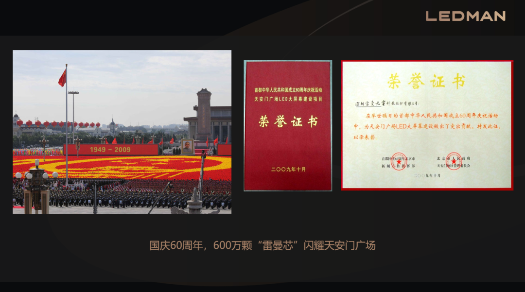 2009 年,雷曼光电成为新中国成立60周年庆典上,天安门广场超大显示屏唯一指定国产LED封装品牌,从进口和国产之争中脱颖而出,成为了有担当的民族品牌,向世界完美展示“中国智造”的实力与魅力。