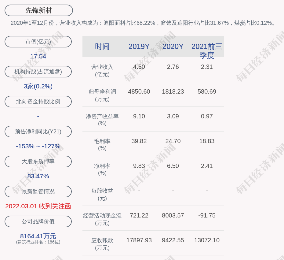 2020年1至12月份,先锋新材的营业收入构成为:遮阳面料占比68.22%,窗饰及遮阳行业占比31.67%,煤炭占比0.12%。