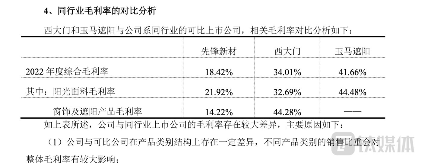 在年报问询函回复中钛媒体App了解到,从同行业毛利率对比分析来看,先锋新材的各方面毛利率低于可比行业的上市公司。如图显示,公司综合毛利率为18.42%,远低于西大门和玉马遮阳的34.01%和41.66%。占总营收比重50.02%和49.63%的阳光面料和窗饰及遮阳毛利率也远低于西大门和玉马遮阳。