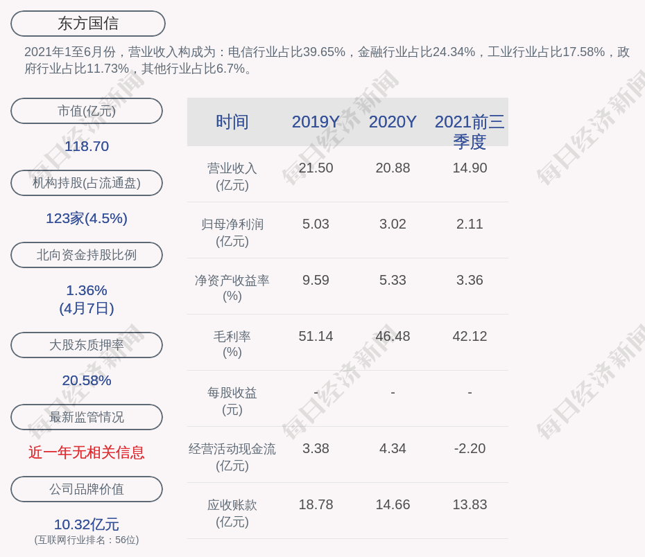 2021年1至6月份,东方国信的营业收入构成为:电信行业占比39.65%,金融行业占比24.34%,工业行业占比17.58%,政府行业占比11.73%,其他行业占比6.7%。