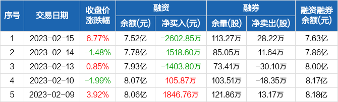 融资方面,当日融资买入1.03亿元,融资偿还1.29亿元,融资净偿还2602.85万元,连续3日净偿还累计5525.25万元。融券方面,融券卖出48.7万股,融券偿还20.48万股,融券余量113.27万股,融券余额1124.76万元。融资融券余额合计7.63亿元。