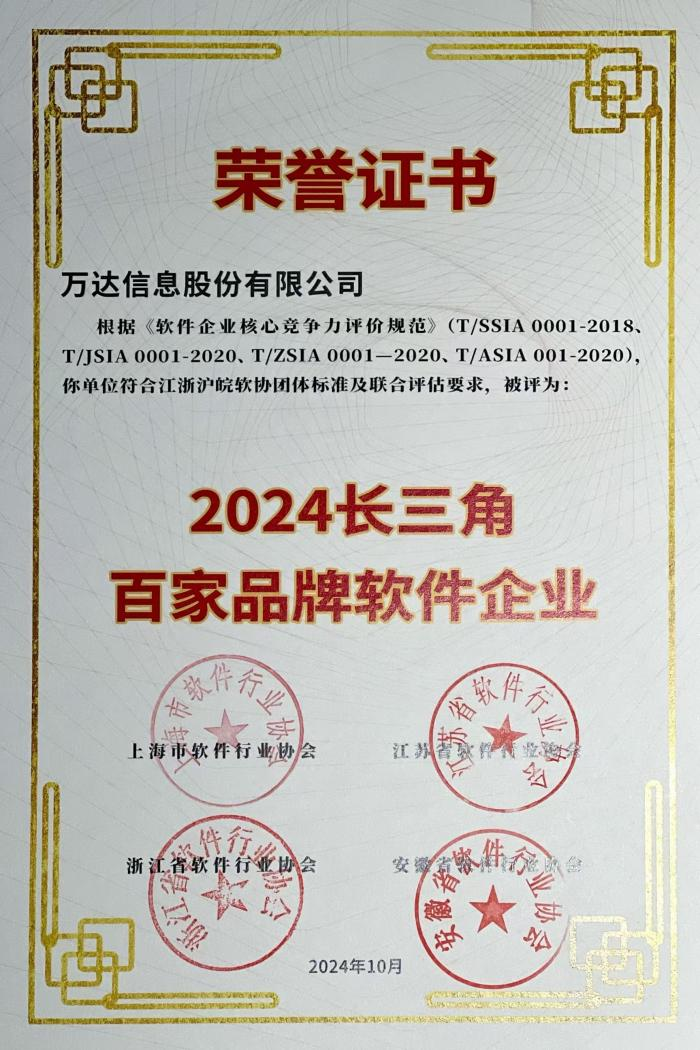 为贯彻落实习近平总书记长三角一体化发展的重要论述,切实推动长三角一体化发展国家战略落地,共同打造长三角区域软件品牌,沪苏浙晥软协按照统一标准,在各自“软件企业核心竞争力评价”的基础上,共同遴选了长三角百家品牌软件企业,万达信息受上海市软件行业协会推荐并获入选“2024长三角百家品牌软件企业”,公司已连续三年获得该荣誉。