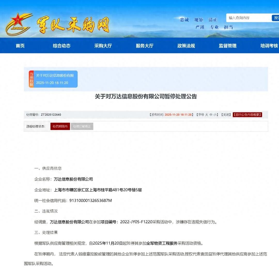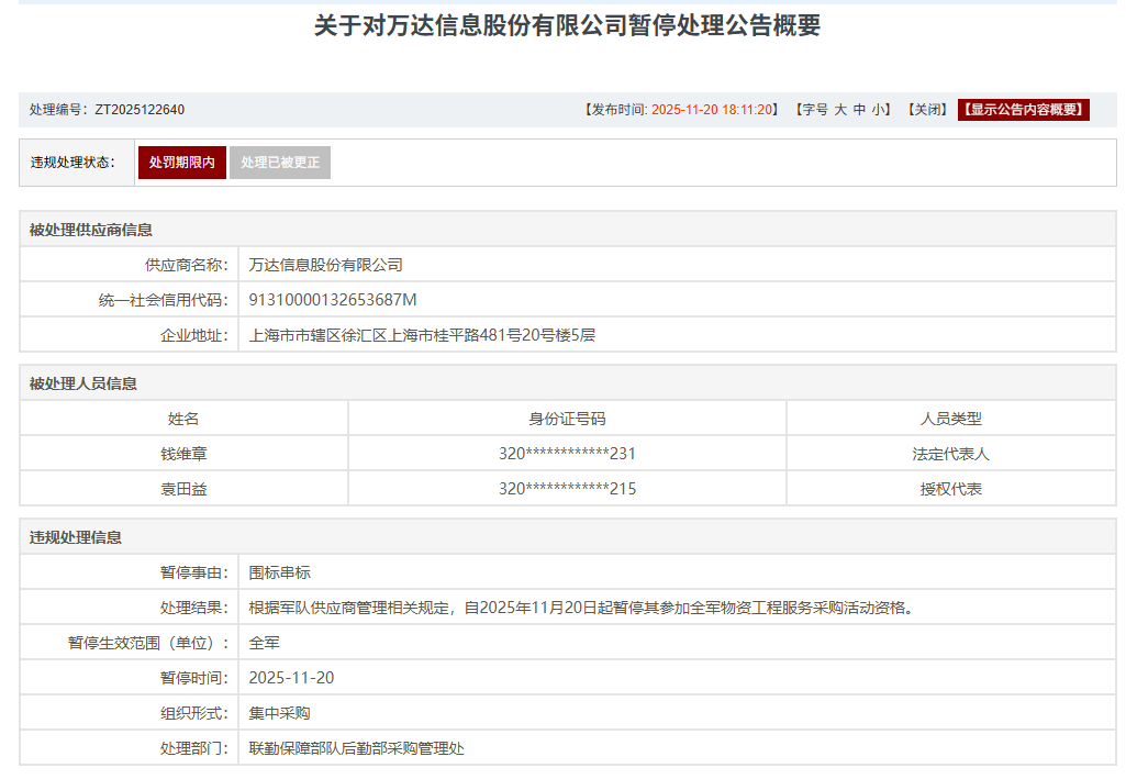 这一决定自2025年11月20日起生效,不仅让 万达信息 自身陷入危机,其法定代表人钱维章控股或管理的其他企业、授权代表袁田益代理的其他供应商也一并被牵连。