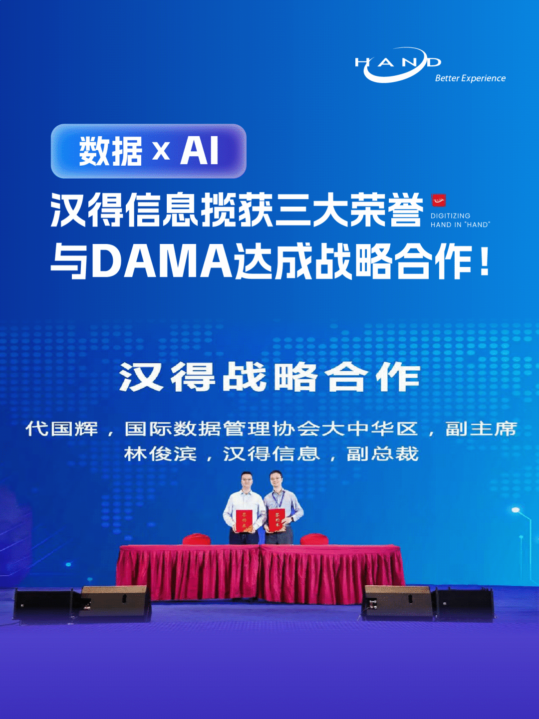 这场以“数据 x AI”为核心主题的行业盛会,汇聚全球政产学研领域的顶尖智慧,汉得凭借在数据管理领域的深厚积累与创新实践,现场一举斩获三项重磅荣誉,并与DAMA达成关键战略合作,同时应邀分享前沿实践成果,全方位彰显专业硬核实力!